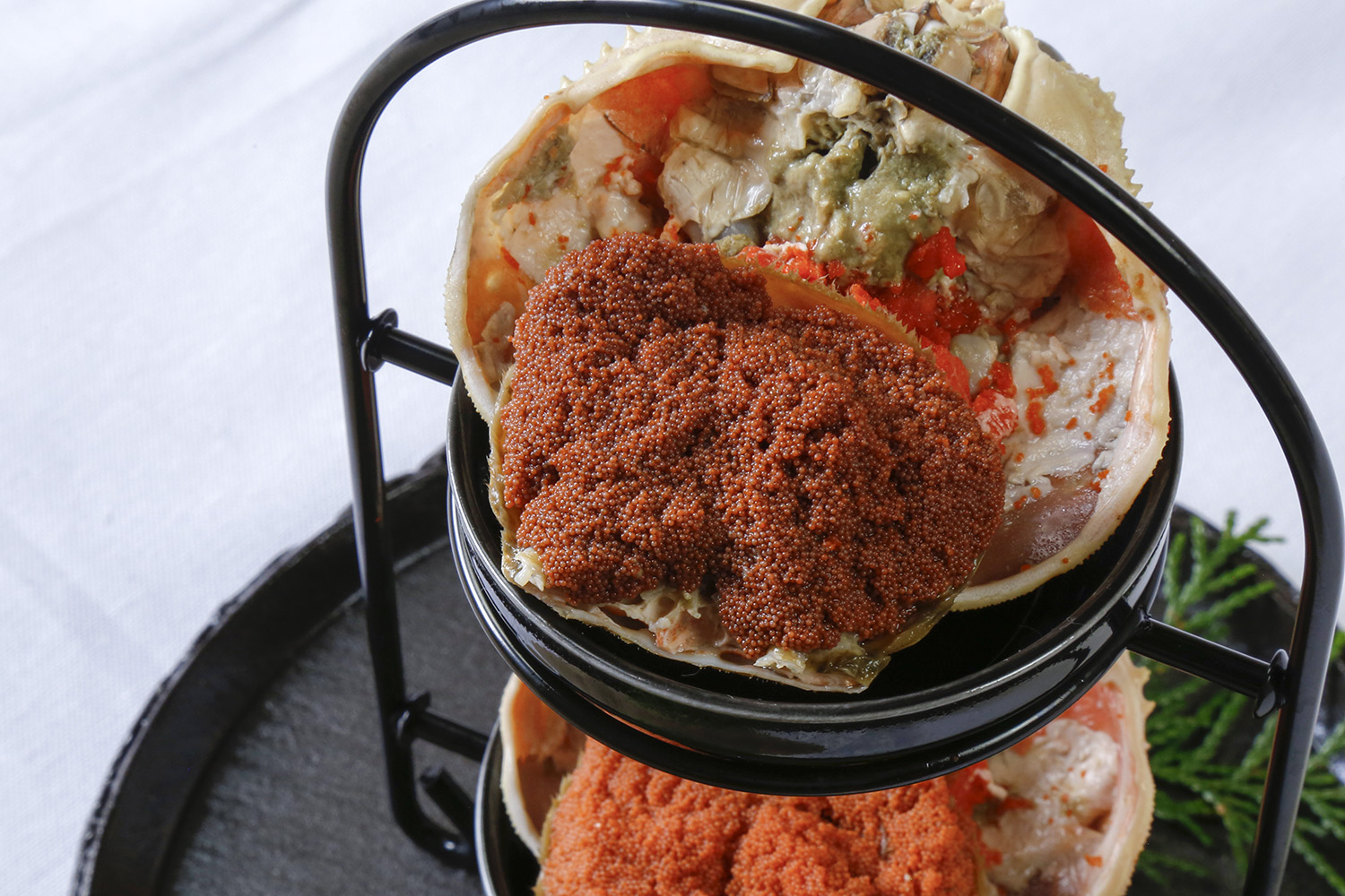 浜茹で香住ガニは姿盛りで、瑞々しくジューシーな甘みを、活け松葉ガニのお造りは、身がぎっしりと詰まっており、ぷりぷりした食感と繊細な甘みを存分にお楽しみいただけます。